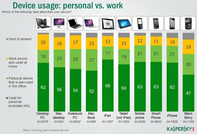 Suprotna situacija, kada je kompanijski uređaj korišćen kod kuće, manje je zastupljena (15%, odnosno 17%), nije ništa manje opasna za podatke kompanije. Situacija sa mobilnim uređajima je vrlo slična: trećina ispitanika koristi moderne smart telefone i tablet uređaje i za zabavu i za rad. Kod korisnika Blackberry telefona ovo je češće nego kod drugih: 26% vlasnika koristi ove smart telefone za rad, dok je 18% ovih poslovnih telefona korišćeno i za ličnu upotrebu. Zaključak je da se čitav niz uređaja - od desktop računara do mobilnih telefona - koristi za čuvanje i obradu poslovnih informacija.