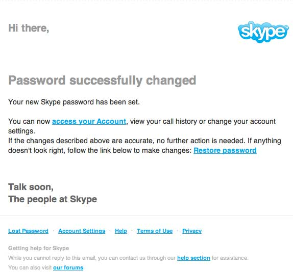 Hoax-Slayer, veb sajt koji informiše korisnike interneta o najnovijim prevarama na internetu, upozorio je na prevaru sa lažnim email obaveštenjima koje navodno šalje popularni VoIP servis Skype, u kojima se korisnici servisa obaveštavaju da je lozinka za pristup Skype nalogu uspešno promenjena.