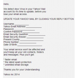 Da bi navodno ažurirao nalog korisnik treba da odgovori na email i pošalje tražene podatke: korisničko ime, Yahoo emal adresu, lozinku, sigurnosno pitanje i odgovor, naziv zemlje u kojoj živi, broj telefona i datum rođenja.