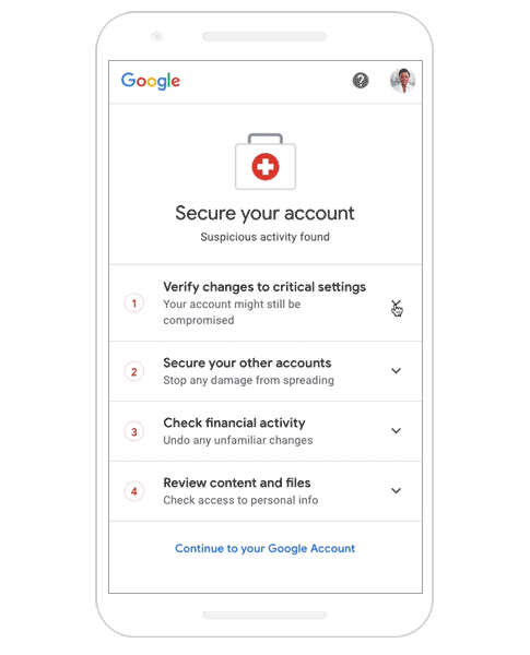 Google će vam pomoći da proverite sigurnosna podešavanja kako bi ste bili sigurni da vaš nalog nije podložan dodatnim napadima i da mu se ne može pristupiti na druge načine, drugim sredstvima kao što je broj telefona za oporavak ili email adresa. Google će vam pomoći da obezbedite druge naloge, jer Google nalog može otvoriti sajber kriminalcima put ka drugim servisima. Google će vam pomoći i da proverite finansijsku aktivnost, kako bi utvrdilo da li su vaša plaćanja povezana sa Google nalogom, zloupotrebljena.