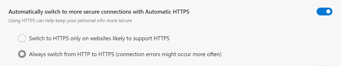 Ako želite da ovu opciju testirate odmah, otvorite edge://settings/privacy i uključite „Automatski prebaci na sigurnije veze pomoću Automatskog HTTPS-a“ (“Automatically switch to more secure connections with Automatic HTTPS”).
