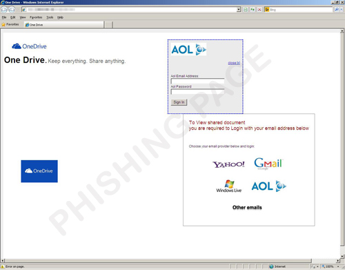Trend Micro je otkrio fišing stranice koje oponašaju popularne sajtove, uključujući i Facebook, Google Docs (Google Drive), OneDrive i nekoliko drugih sajtova. Ono što je jedinstveno kod ovih stranica je da one pružaju mogućnost prijavljivanja na naloge nekoliko email servisa. Korisnici se mogu prijaviti na Yahoo, Gmail, AOL i Windows Live. Ponuđena je i opcija “drugi emailovi”, ako se email provajder čije usluge koristi korisnik ne nalazi na listi. Šta god da unesete u prazna polja, umesto pravog korisničkog imena i lozinke, biće prihvaćeno kao validno, što je siguran znak da je jedina svrha ovih stranica prikupljanje i krađa podataka korisnika.