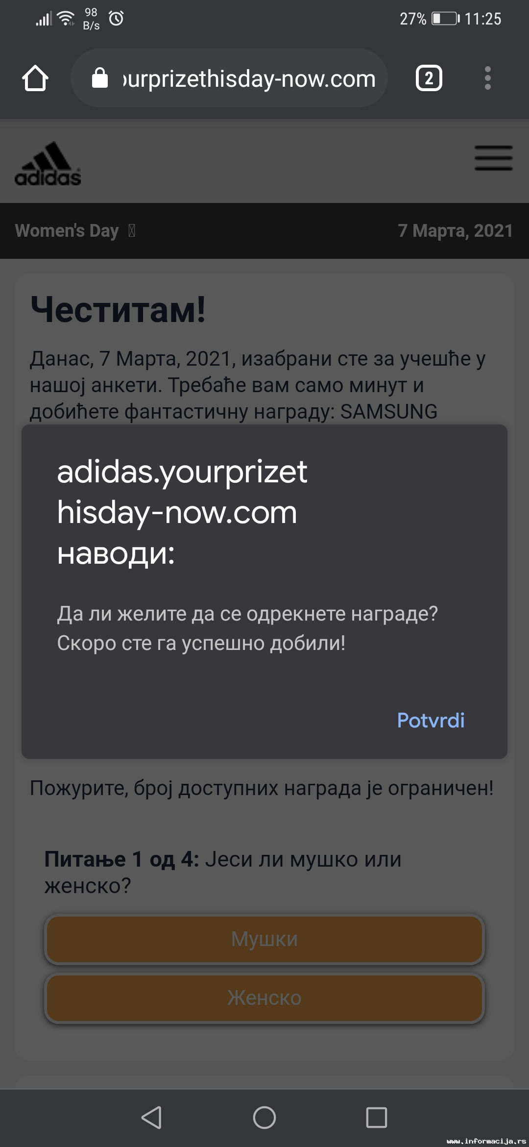 Poruka sadrži link sa logom Adidasa i tekstom “Nabavite besplatne poklone”. Kada se klikne na link, otvara se stranica na kojoj u gornjem levom uglu stoji logo Adidasa iako adresa sajta (adidas.yourprizethisday-now[.]com) jasno ukazuje na to da on nema nikakve veze sa poznatim proizvođačem sportske opreme.