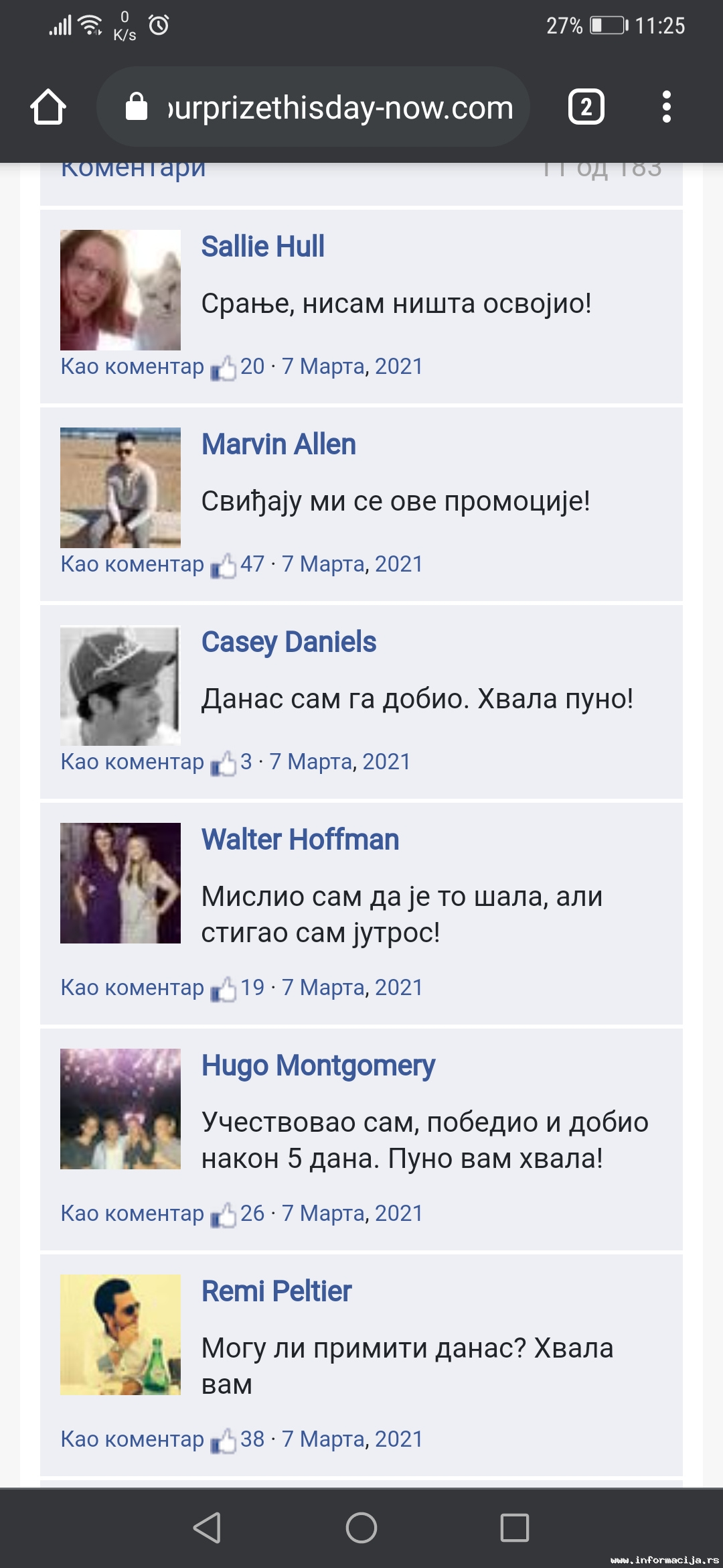 Da bi izgledalo uverljivije, na istoj stranici su i komentari navodnih srećnih dobitnika koji svi do jednog imaju strana imena, ali pišu ćirilicom, na srpskom.